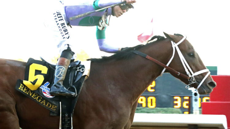 In his previous start, Renegade was a 3 ¾-length winner of the Sam F. Davis Stakes at 1 1/16 miles Feb. 7 at Tampa Bay Downs. That race, Renegade’s 3-year-old debut, generated a 93 Beyer Speed Figure, then a career high. Renegade ($1,031,500) surpassed $1 million in career earnings with his Arkansas Derby victory.